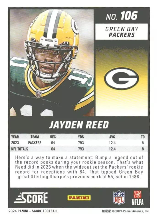 2024 Panini Score Football Jayden Reed Green Bay Packers #106