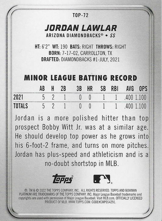 2022 Topps Bowman Platinum Top Prospects Jordan Lawlar Arizona Diamondbacks #TOP-72