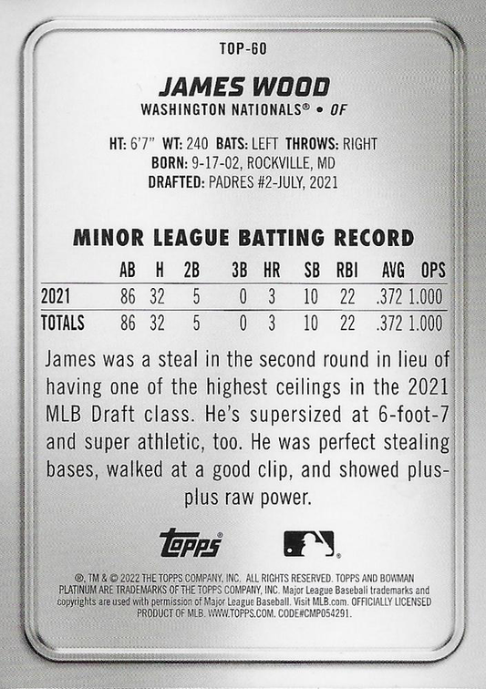 2022 Topps Bowman Platinum Top Prospects James Wood Washington Nationals #TOP-60