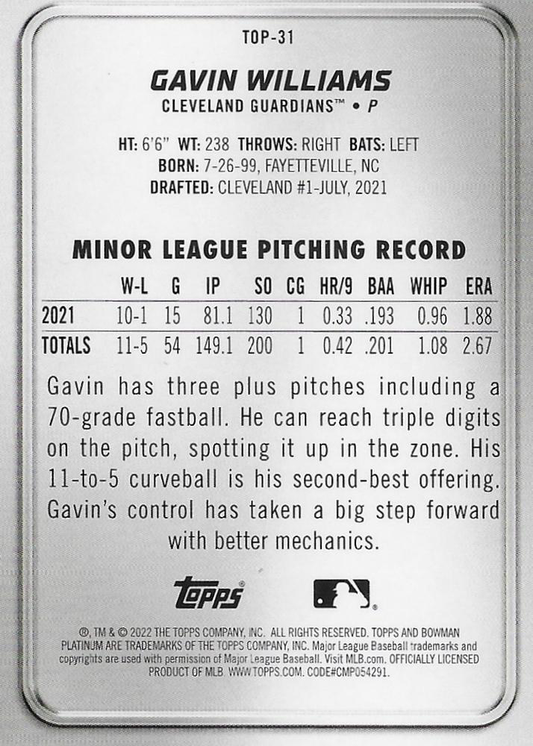 2022 Topps Bowman Platinum Top Prospects Gavin Williams Cleveland Guardians #TOP-31