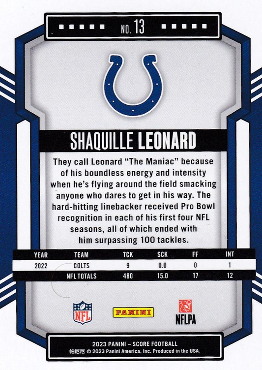 2023 Panini Score Football Shaquille Leonard Indianapolis Colts #13