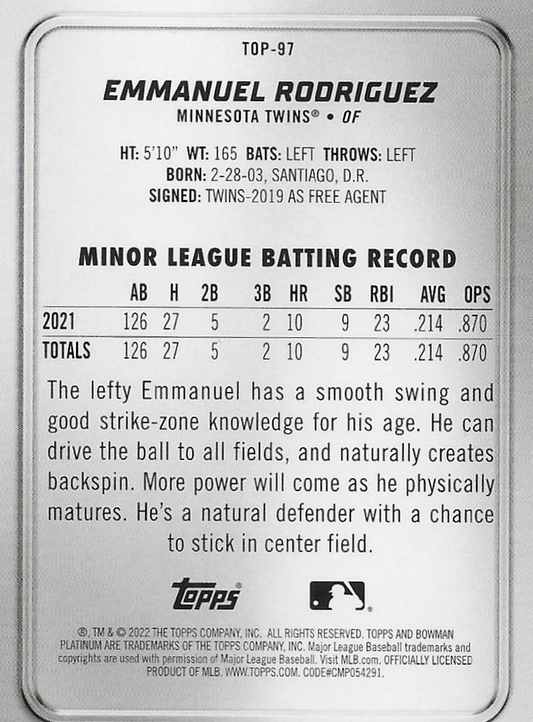 2022 Topps Bowman Platinum Top Prospects Emmanuel Rodriguez Minnesota Twins #TOP-97