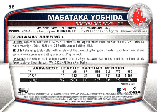 2023 ToppsBowman Masataka Yoshida RC Boston Red Sox #58