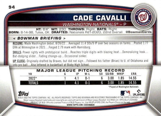2023 Topps Bowman Cade Cavalli RC Washington Nationals #94
