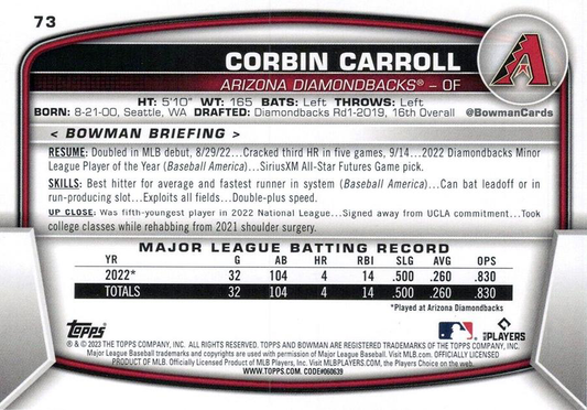 2023 Topps Bowman Corbin Carroll RC Arizona Diamondbacks #73