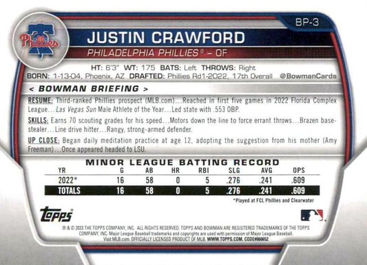 2023 Topps Bowman Paper Prospects Justin Crawford 1st Philadelphia Phillies #BP-3