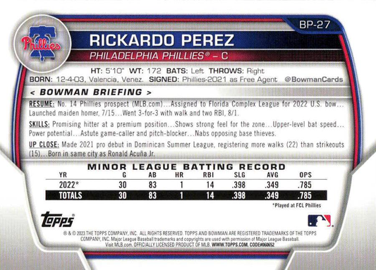 2023 Topps Bowman Paper Prospects Rickardo Perez 1st Philadelphia Phillies #BP-27