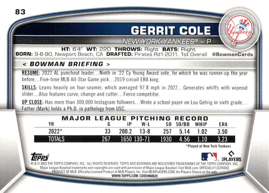 2023 Topps Bowman Gerrit Cole New York Yankees #83