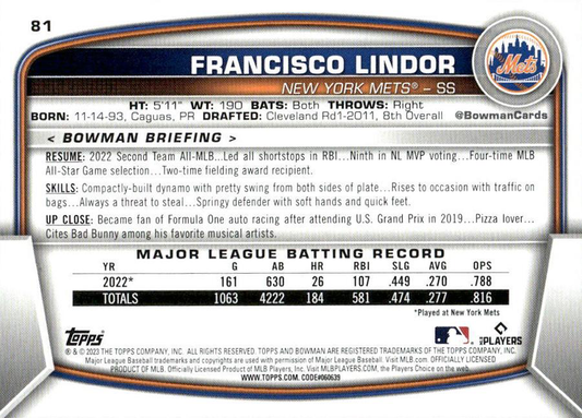 2023 Topps Bowman Francisco Lindor New York Mets #81