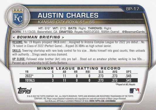 2023 Topps Bowman Paper Prospects Austin Charles 1st Kansas City Royals #BP-17