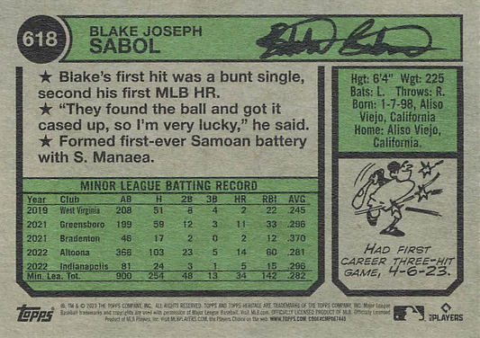 2023 Topps Heritage Blake Sabol RC San Francisco Giants #618
