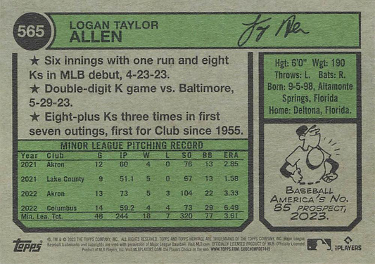 2023 Topps Heritage Logan Allen RC Cleveland Guardians #565