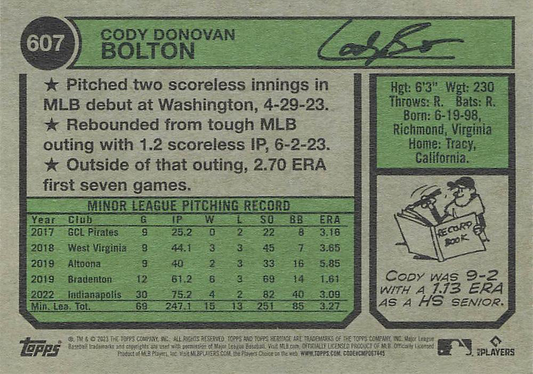 2023 Topps Heritage Cody Bolton RC Pittsburgh Pirates #607