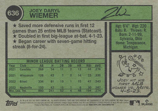2023 Topps Heritage Joey Wiemer RC Milwaukee Brewers #636
