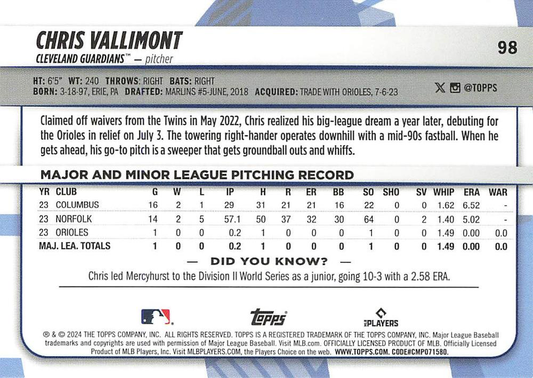 2024 Topps Big League Common Chris Vallimont RC Cleveland Guardians #98