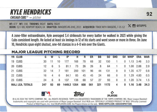 2024 Topps Big League Common Kyle Hendricks Chicago Cubs #92