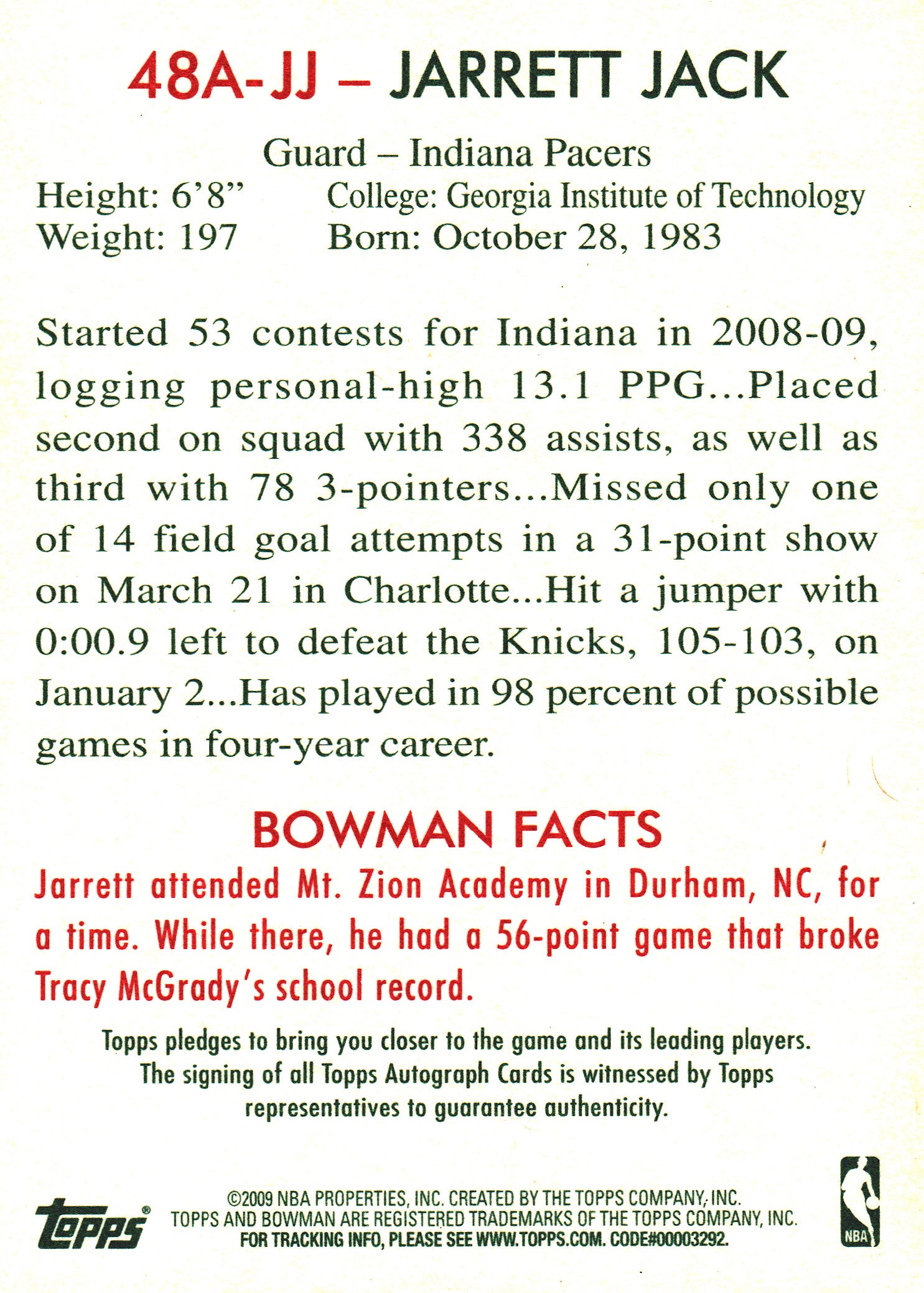 2009 Bowman NBA Jarrett Jack Autograph #48A-JJ Indiana Pacers