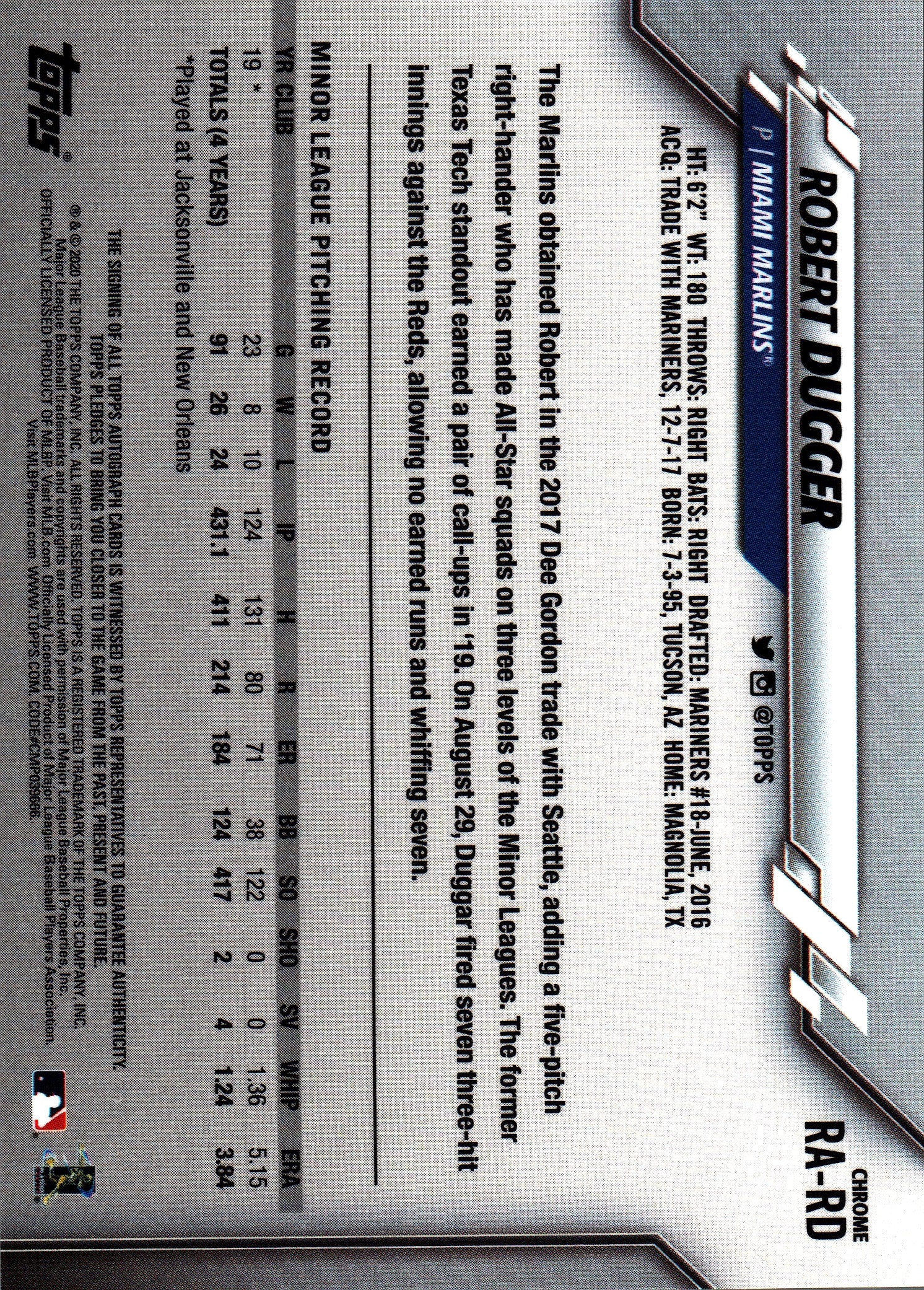 2020 Topps Chrome RC Autographs Robert Dugger #RA-RD Miami Marlins
