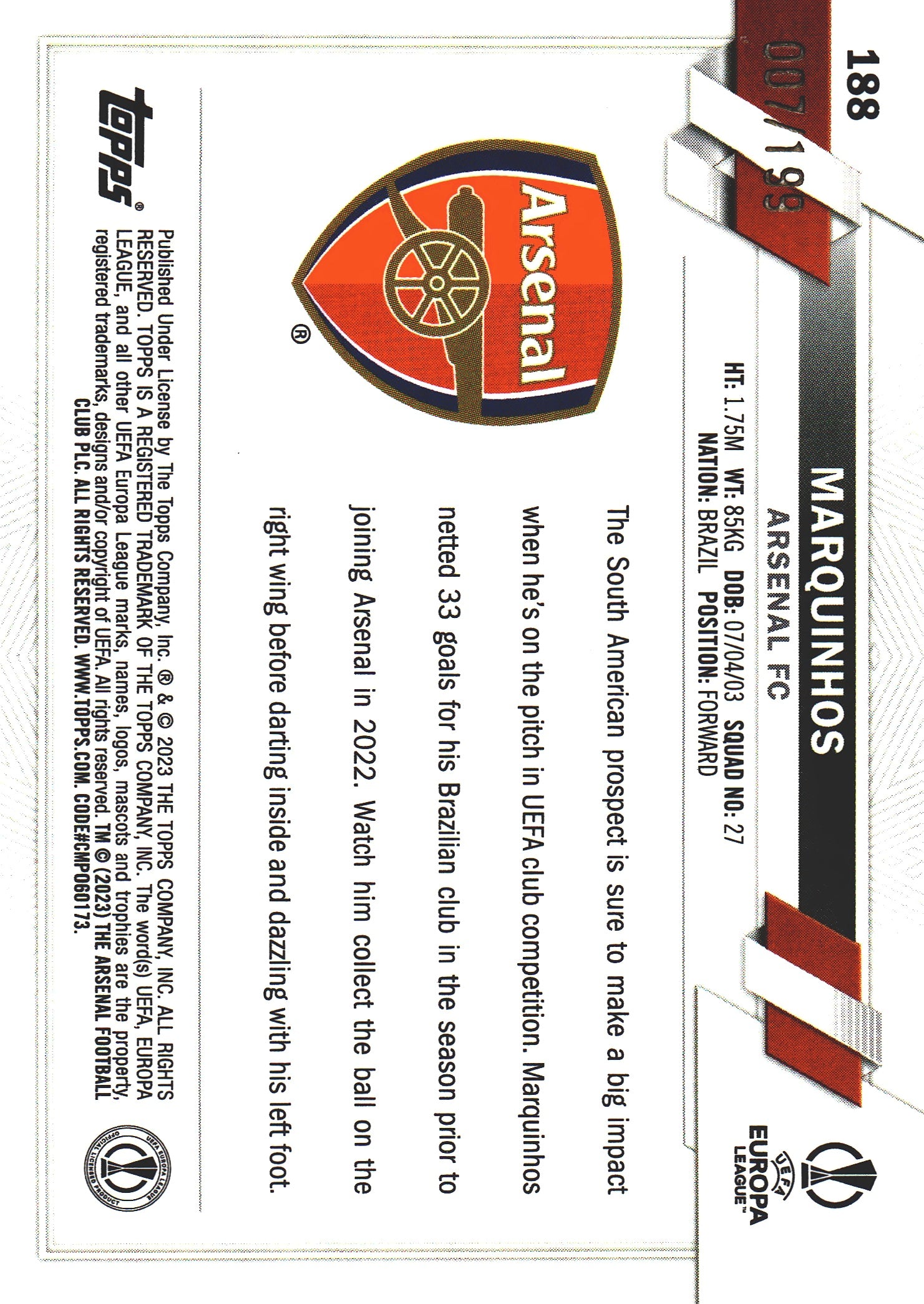 2022 Topps Chrome UCC Aqua Lava /199 Marquinhos RC #188 Arsenal