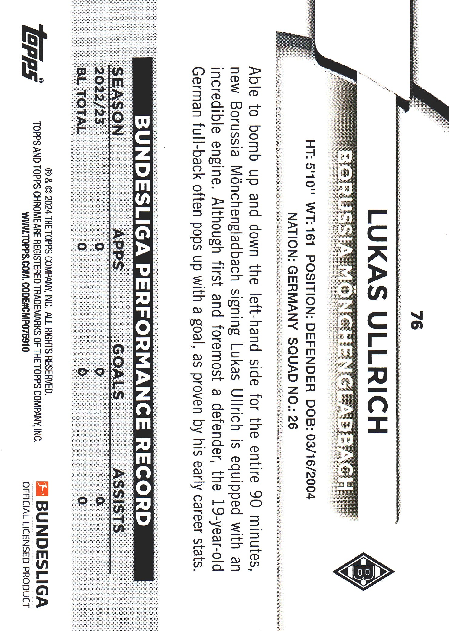 2023 Topps Bundesliga Jade Edition Lukas Ullrich RC #76 Borussia Monchengladbach