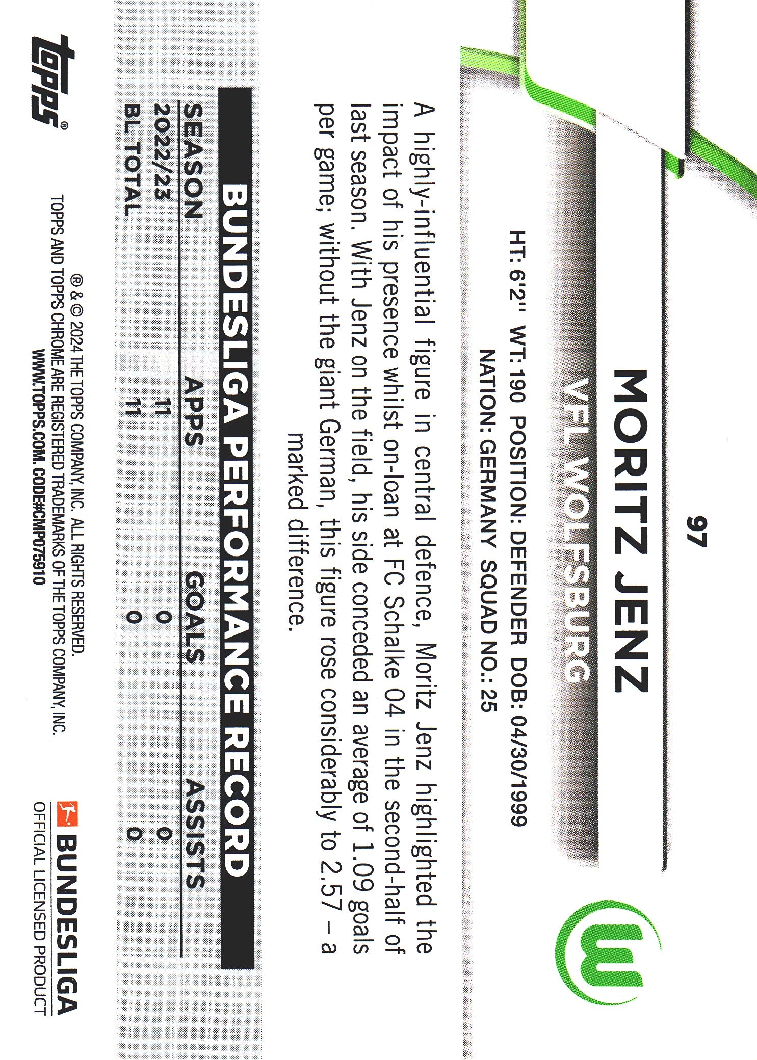 2023 Topps Bundesliga Jade Edition Moritz Jenz RC #97 VfL Wolfsburg