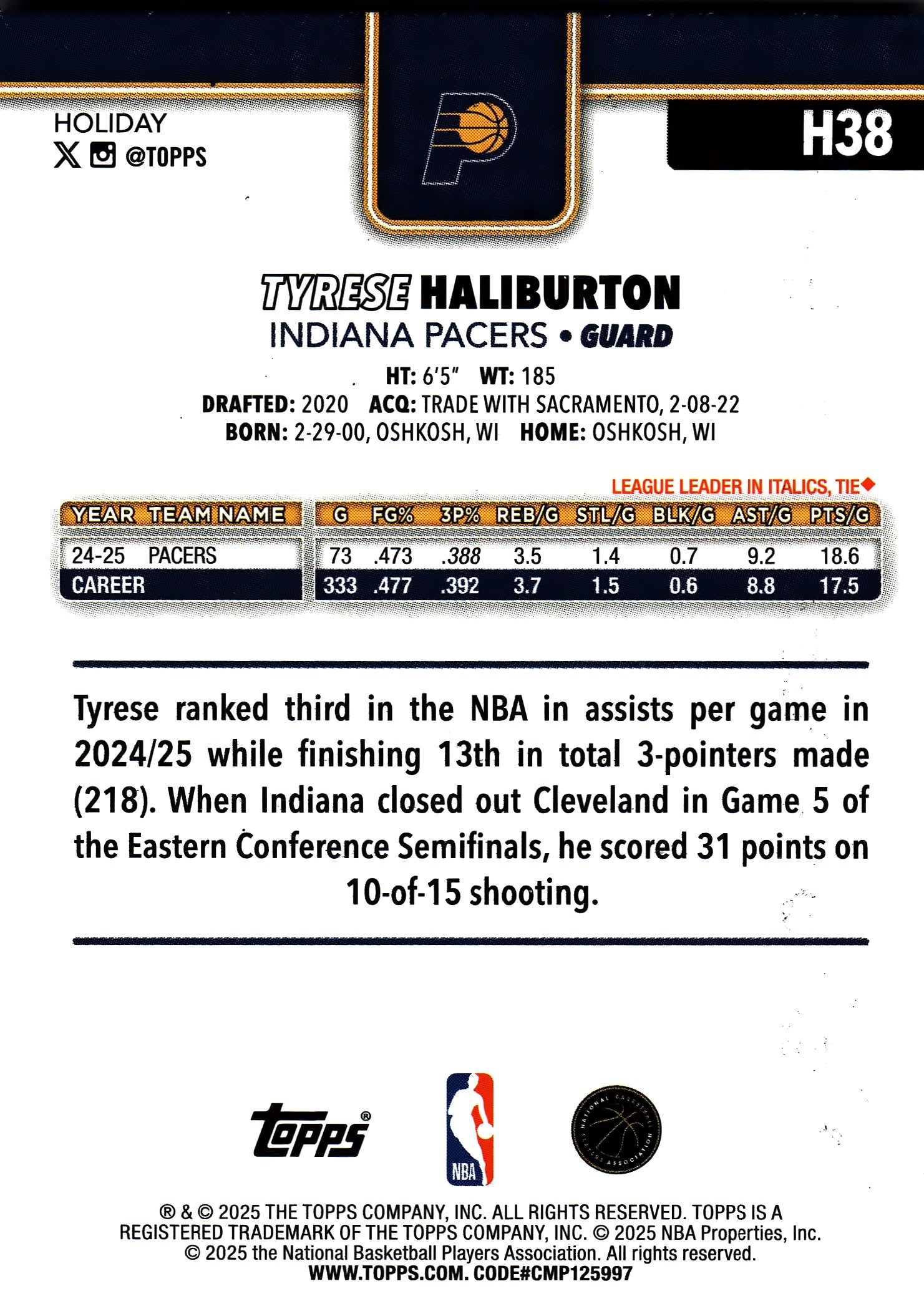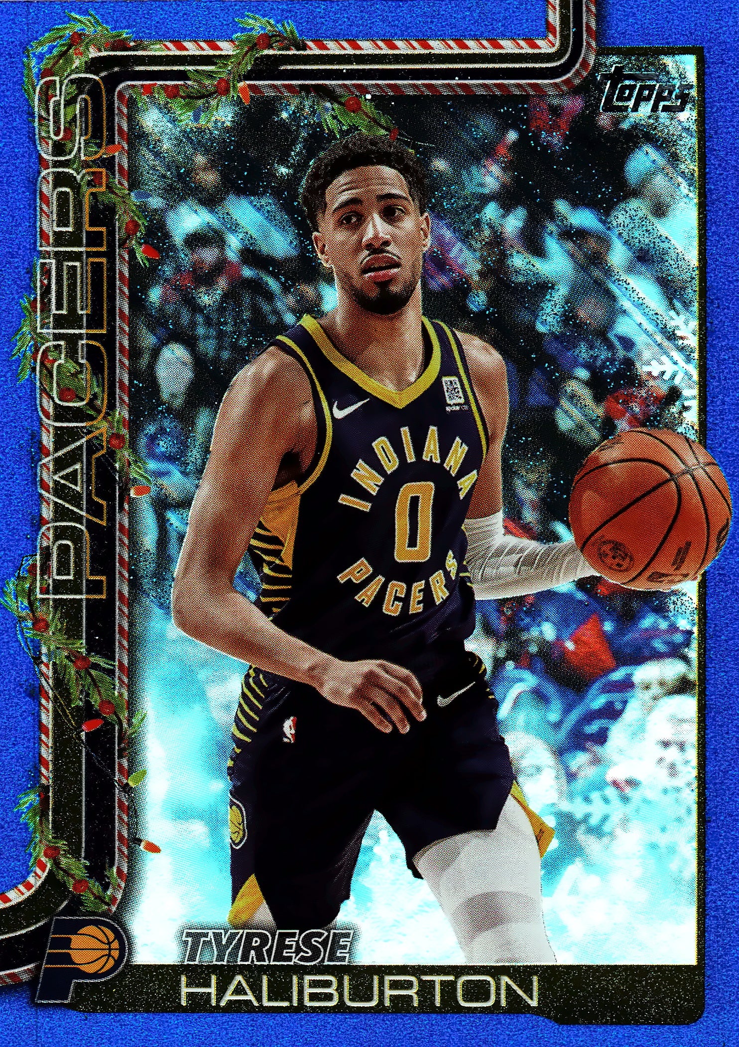 2025 Topps Holiday Blue Metallic Glitter Tyrese Haliburton #H38 Indiana Pacers