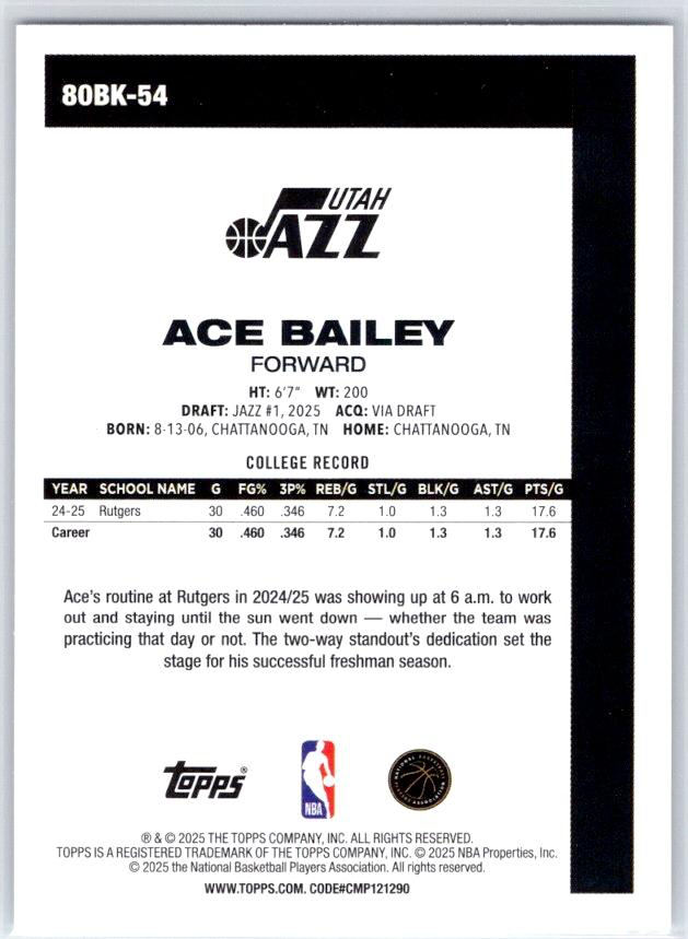 2025 Topps NBA 1980-81 Topps Basketball Ace Bailey 80BK-54 Utah Jazz
