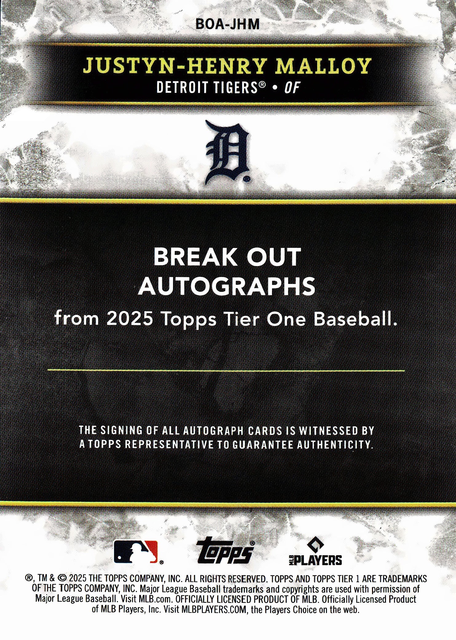 2025 Topps Tier One Break Out Autographs Justyn-Henry Malloy #BOA-JHM Detroit Tigers
