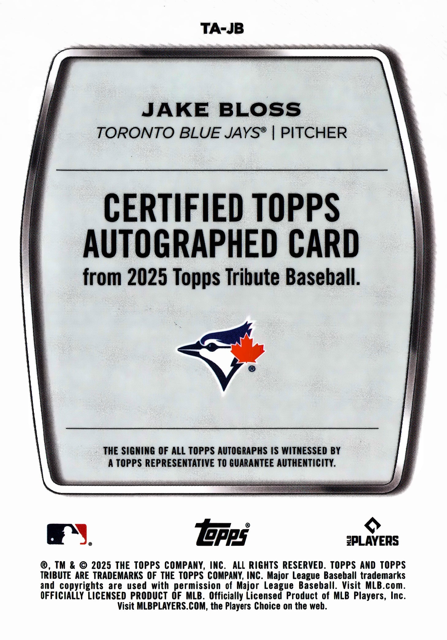 2025 Topps Tribute Autograph Jake Bloss /150 #TA-JB Toronto Blue Jays