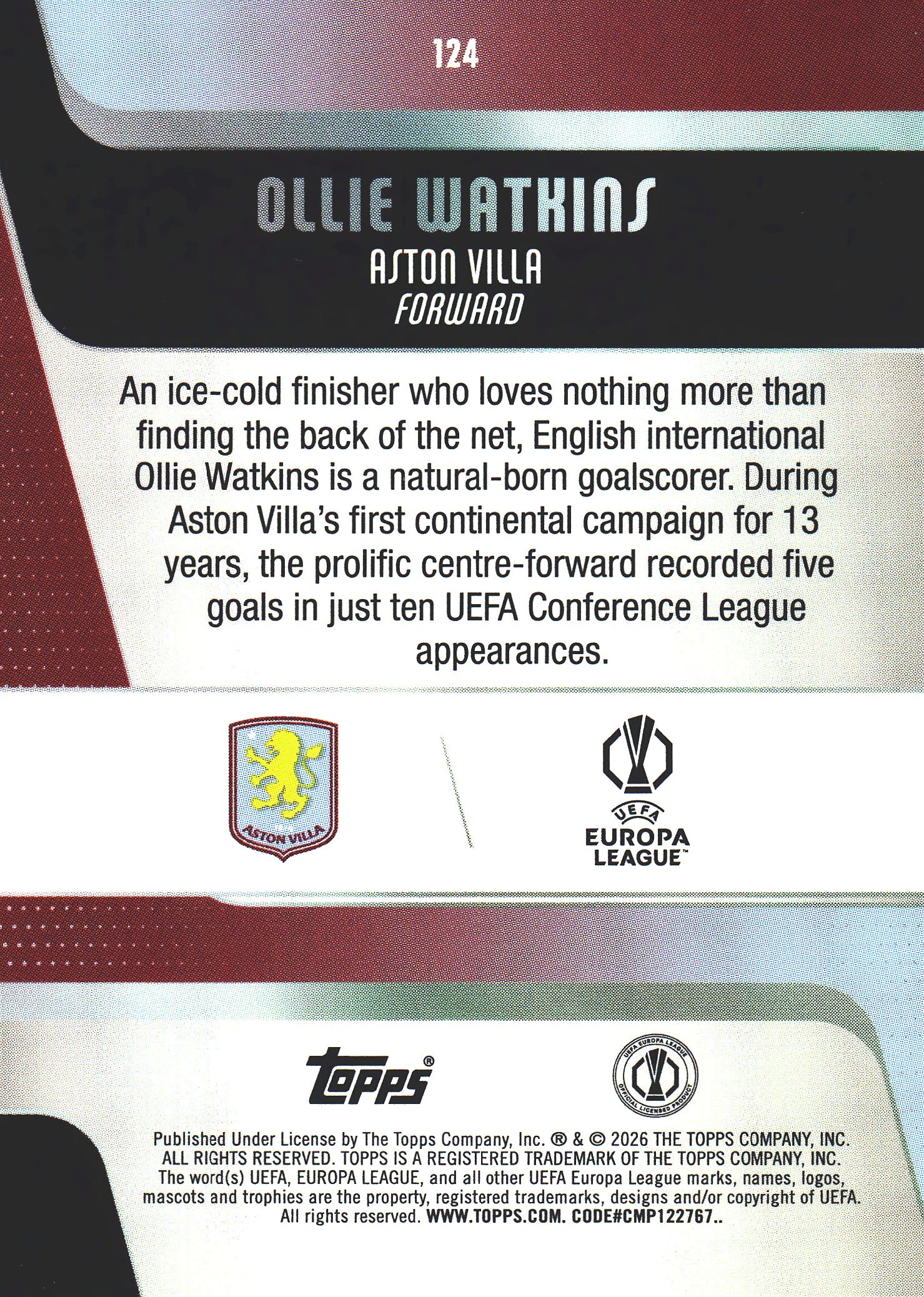 2025 Topps UCC Ollie Watkins Yellow Inferno Holo /299 #124 Aston Villa