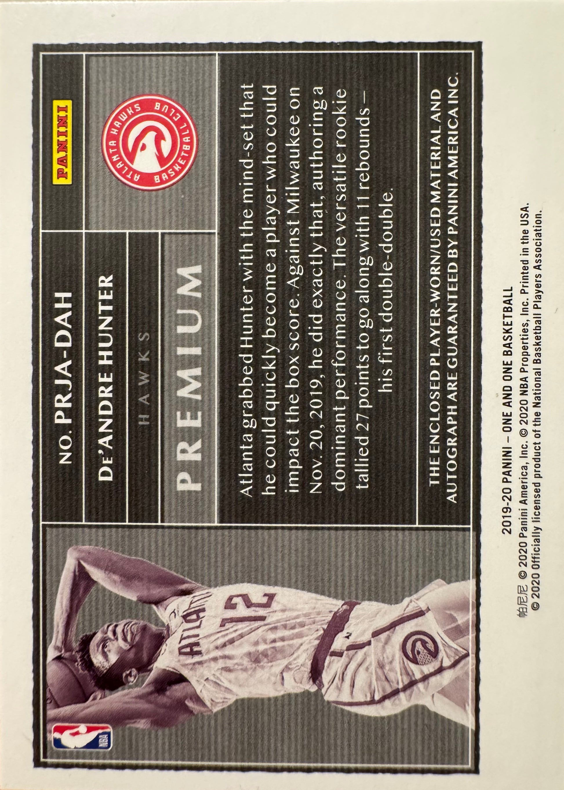 2019 Panini One RPA Patch Autograph /99 De'Andre Hunter RC #PRJA-DAH Atlanta Hawks