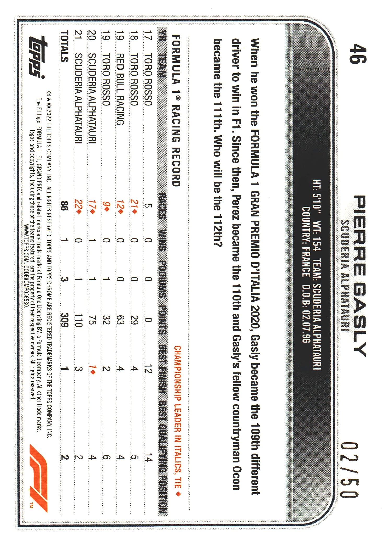 2022 Topps Chrome Sapphire Formula 1 Pierre Gasly Gold /50 #46 AlphaTauri