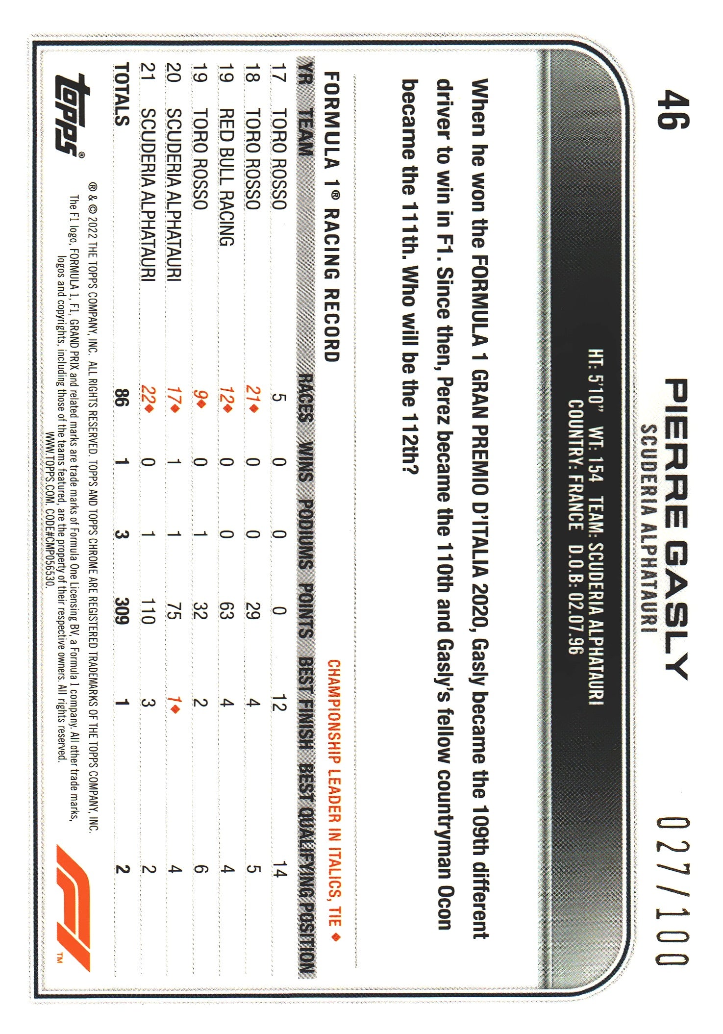 2022 Topps Chrome Sapphire Formula 1 Pierre Gasly Sepia /100 #46 AlphaTauri