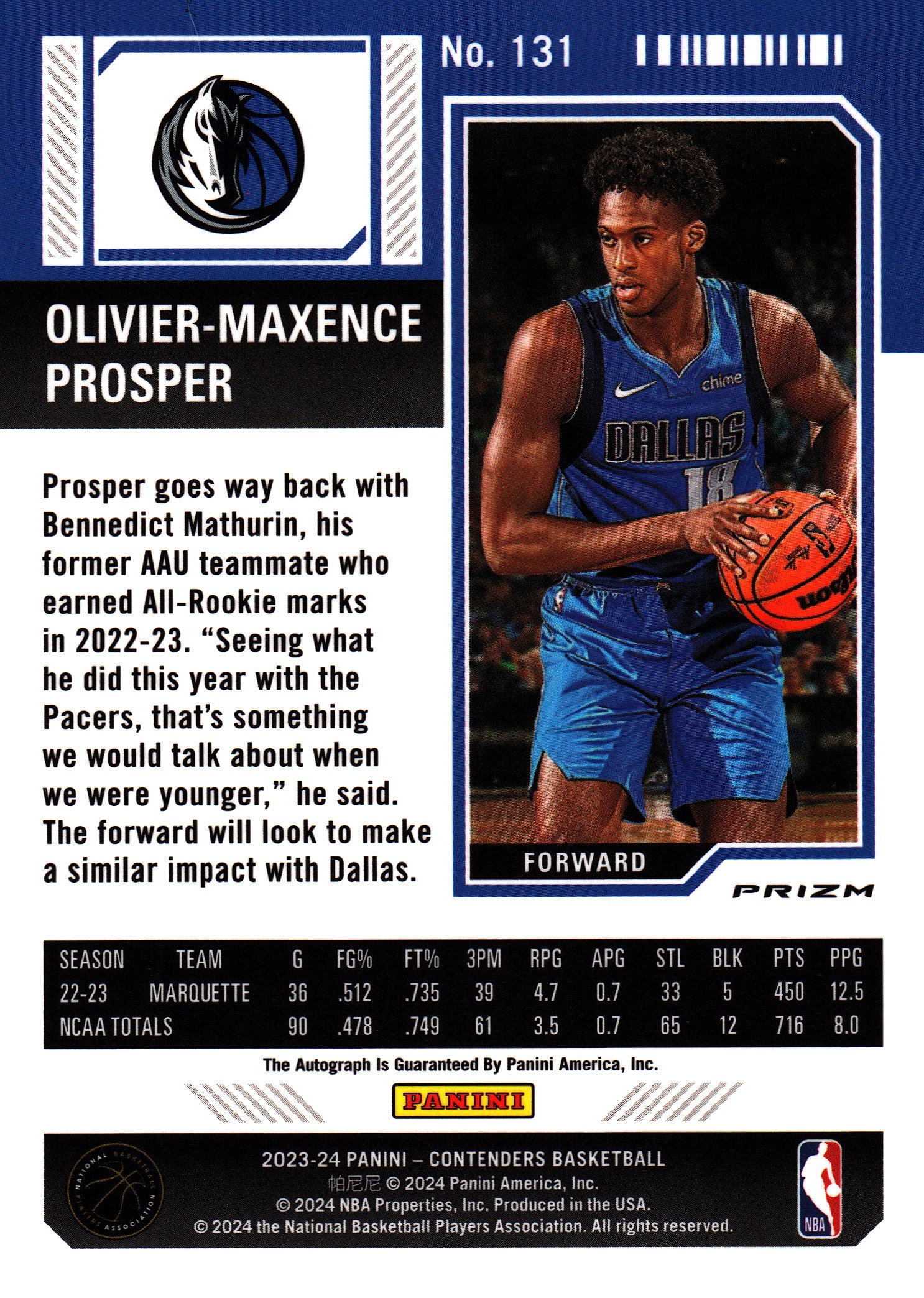 2023 Panini Contenders Optic RC Olivier-Maxence Prosper Autograph #131 Dallas Mavericks