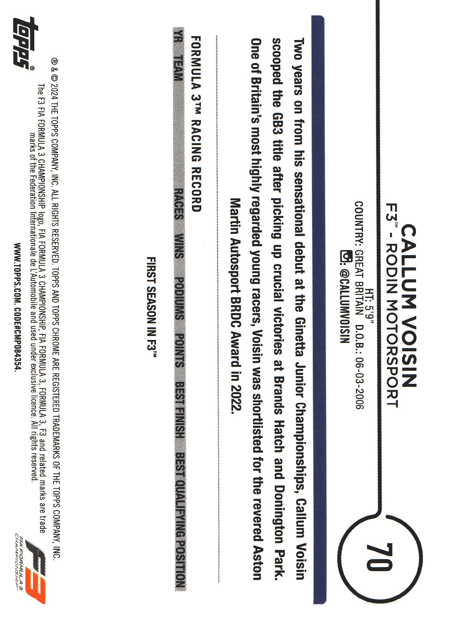 2024 Topps Chrome Formula 1 Logofractor Callum Voisin F3 #70 Rodin