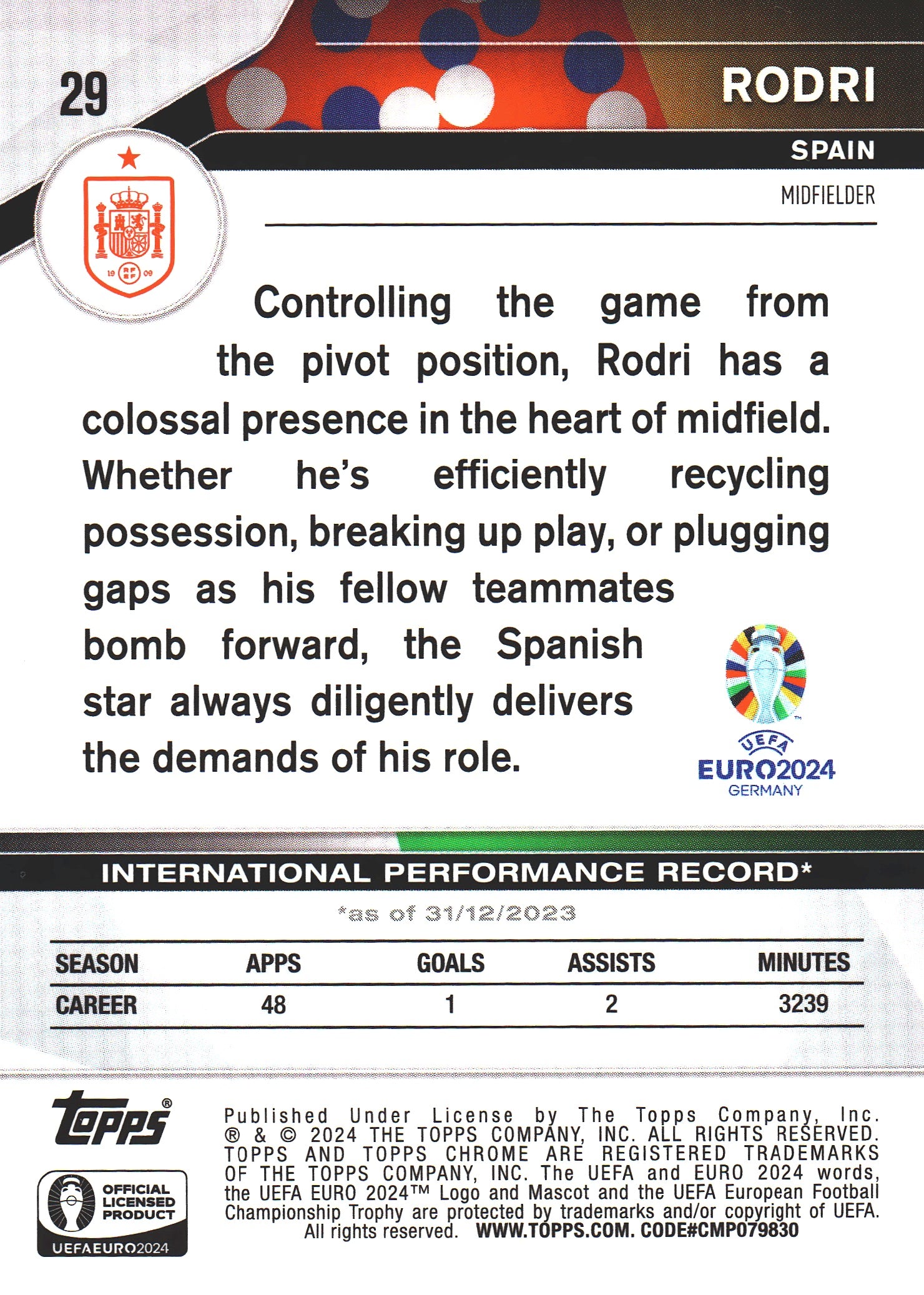 2024 Topps Chrome Sapphire Euro 2024 Sapphire Gold /50 Rodri #29 Spain