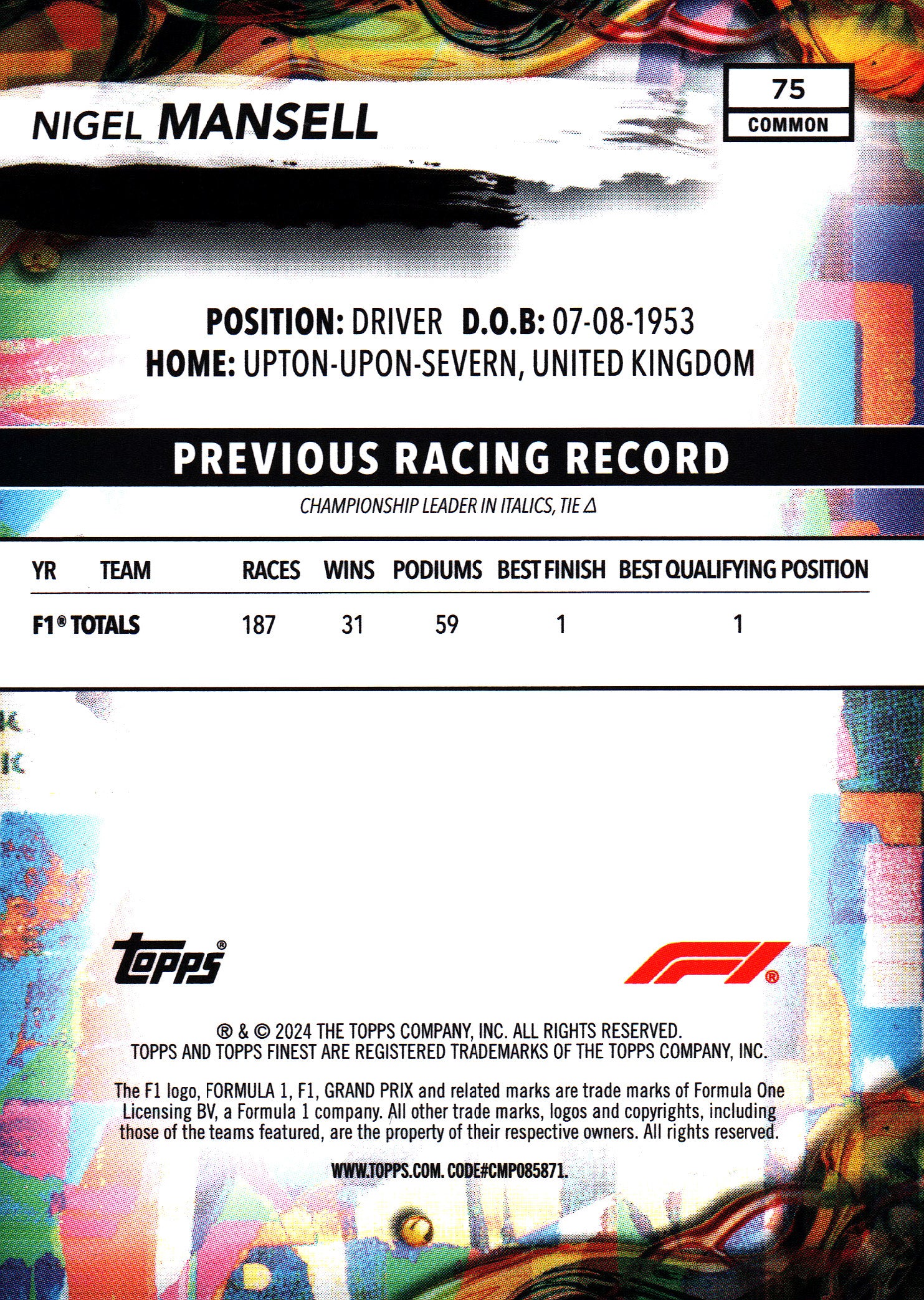 2024 Topps Finest Formula 1 Common Blue /200 Nigel Mansell #75 Williams