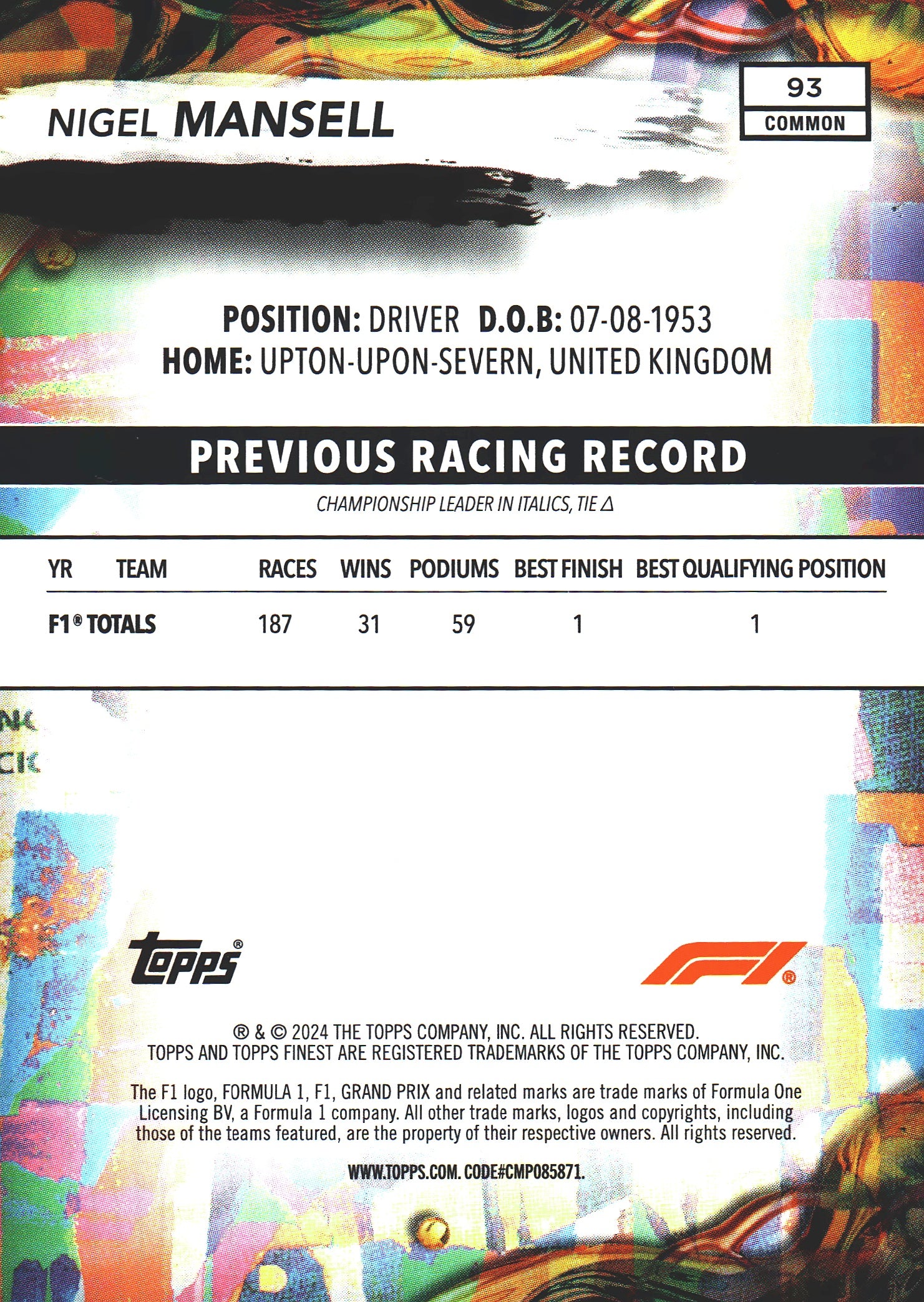 2024 Topps Finest Formula 1 Nigel Mansell #93 Williams