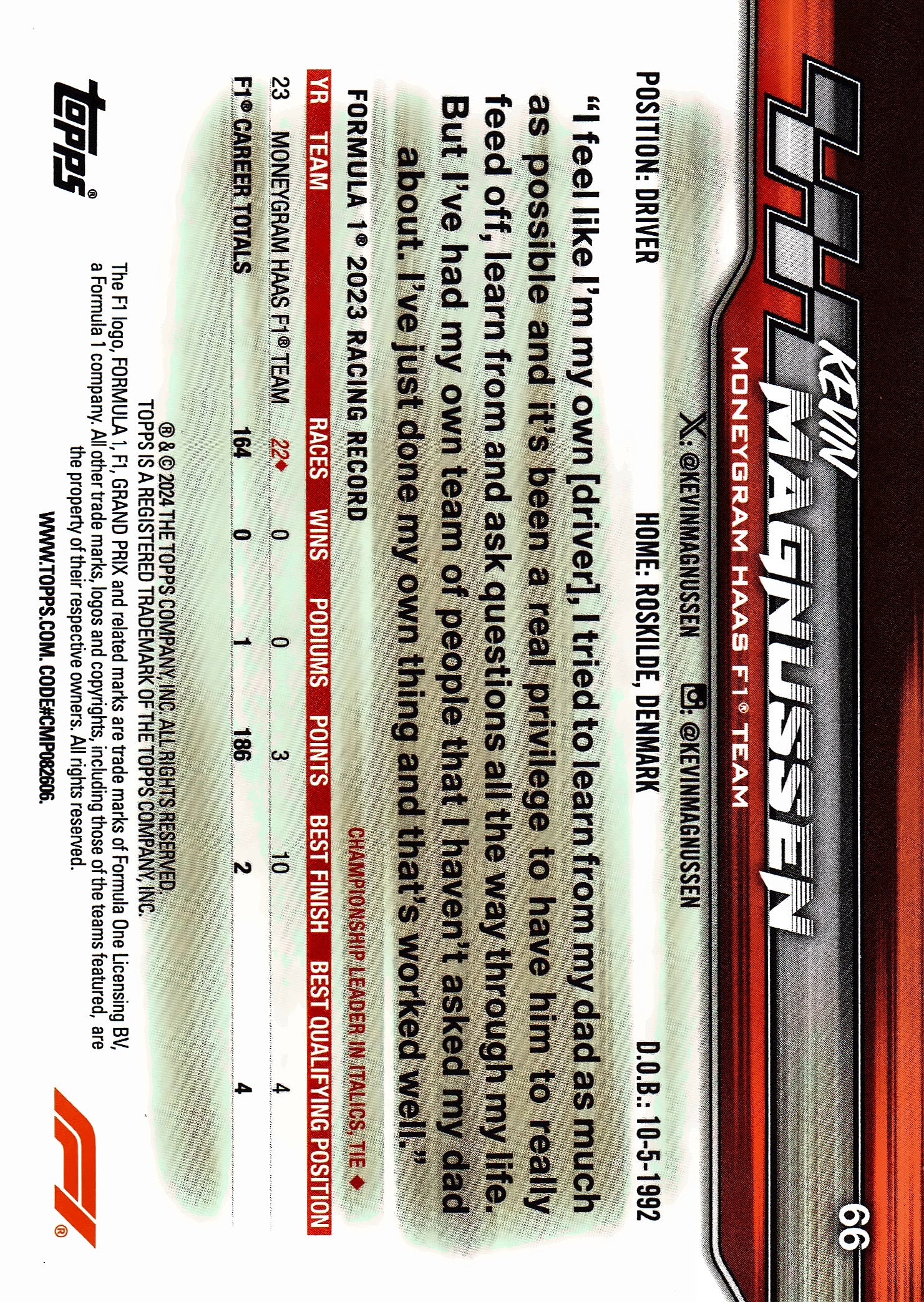 2024 Topps Paddock Pass Formula 1 Black and White FoilKevin Magnussen #66 Haas