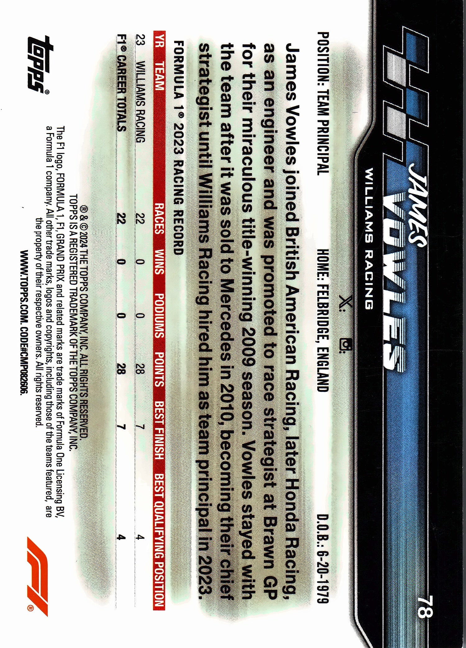 2024 Topps Paddock Pass Formula 1 Black Foil James Vowles TP #78 Williams