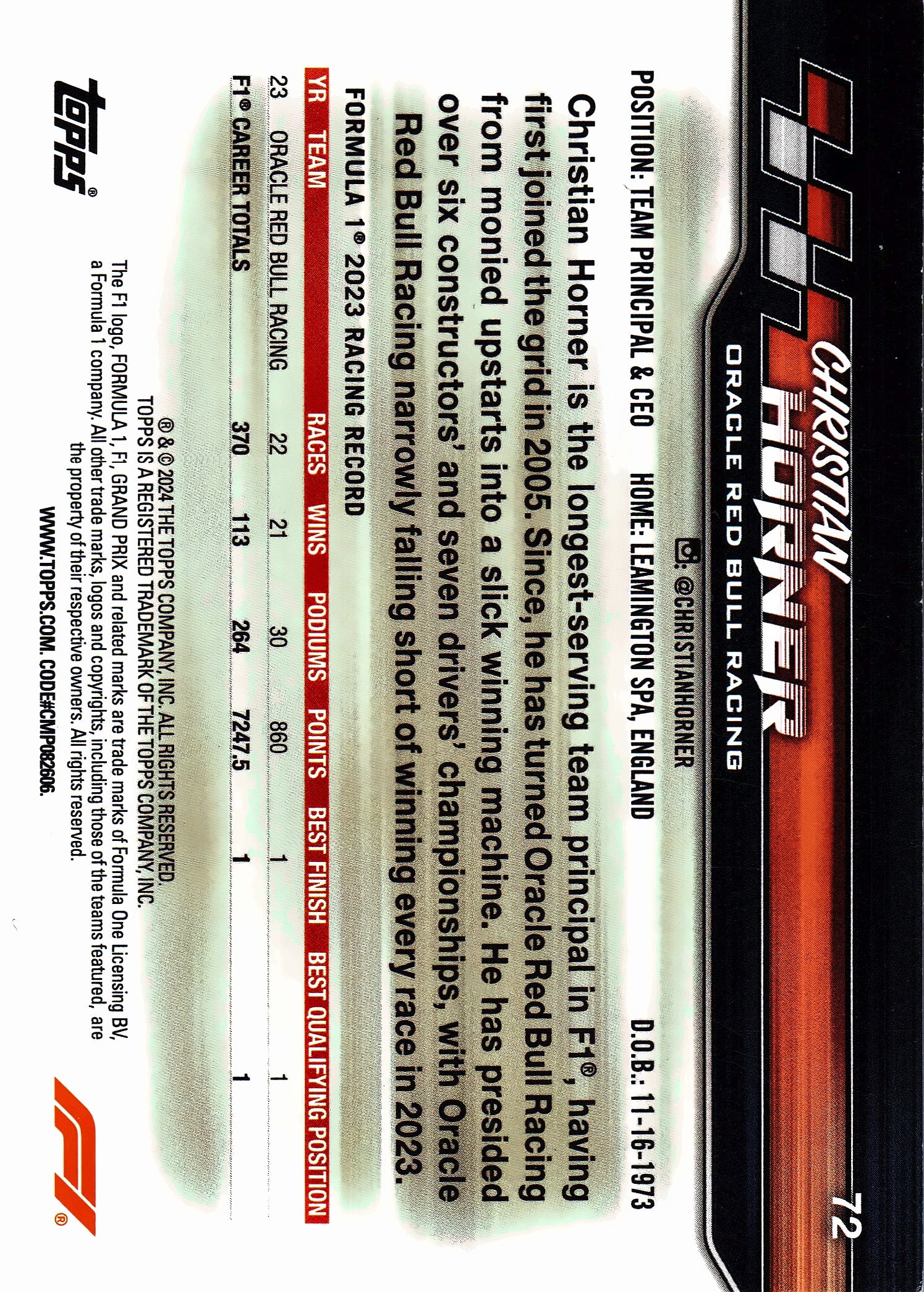 2024 Topps Paddock Pass Formula 1 Sepia Christian Horner #72 Red Bull