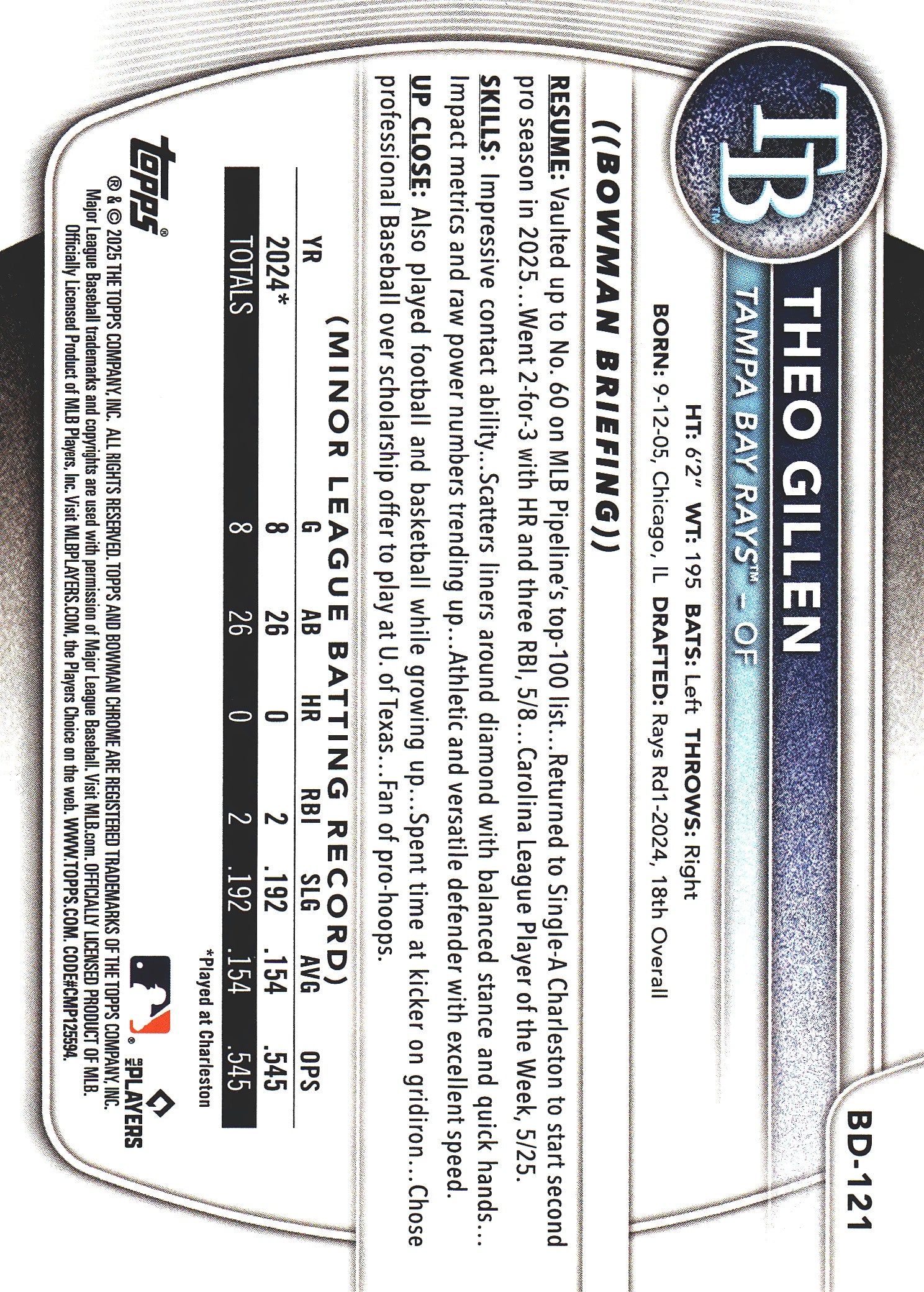 2025 Topps Bowman Draft Sky Blue /499 Theo Gillen #BD-121 Tampa Bay Rays