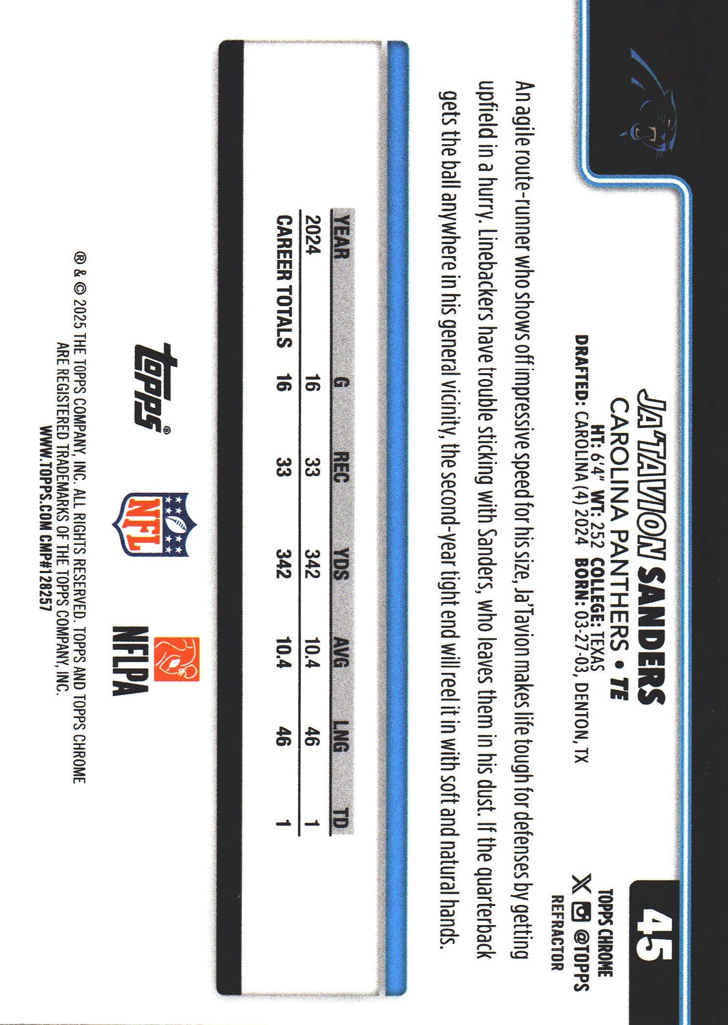 2025 Topps Chrome NFL Refractor Ja'Tavion Sanders #45 Carolina Panthers
