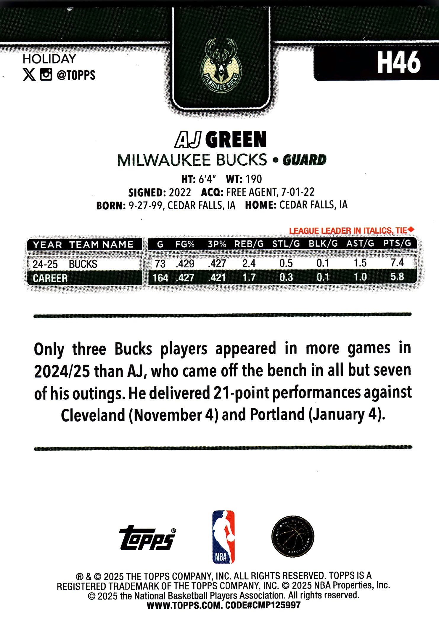 2025 Topps Holiday Light Blue and White Glitter A.J. Green #H46 Milwaukee Bucks