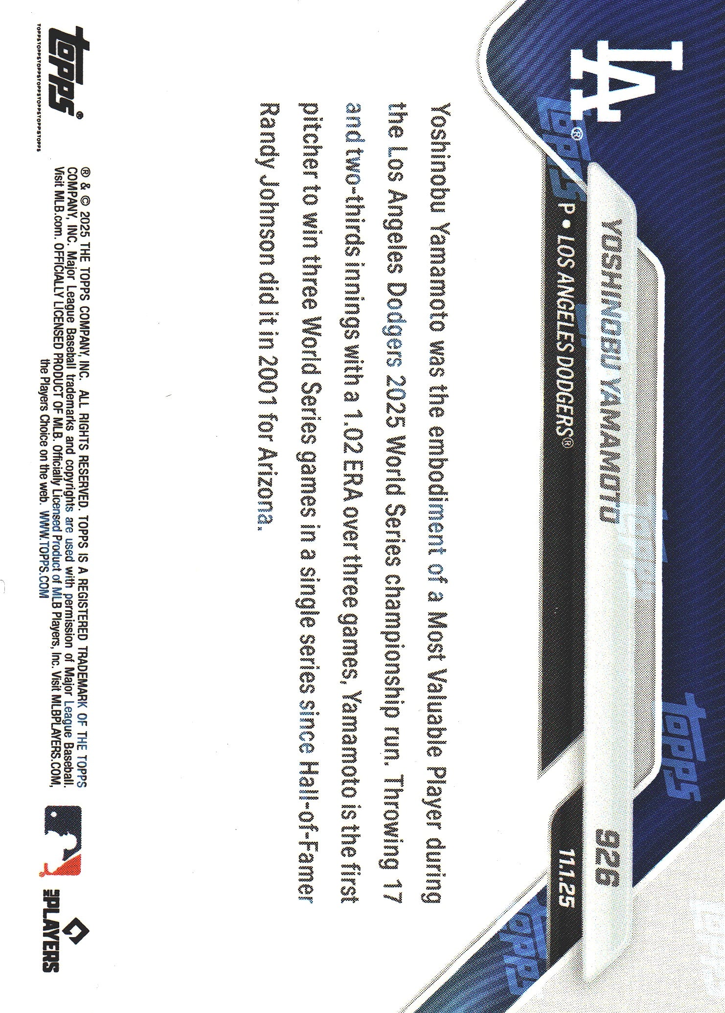 2025 Topps Now Yoshinobu Yamamoto #926 Los Angeles Dodgers
